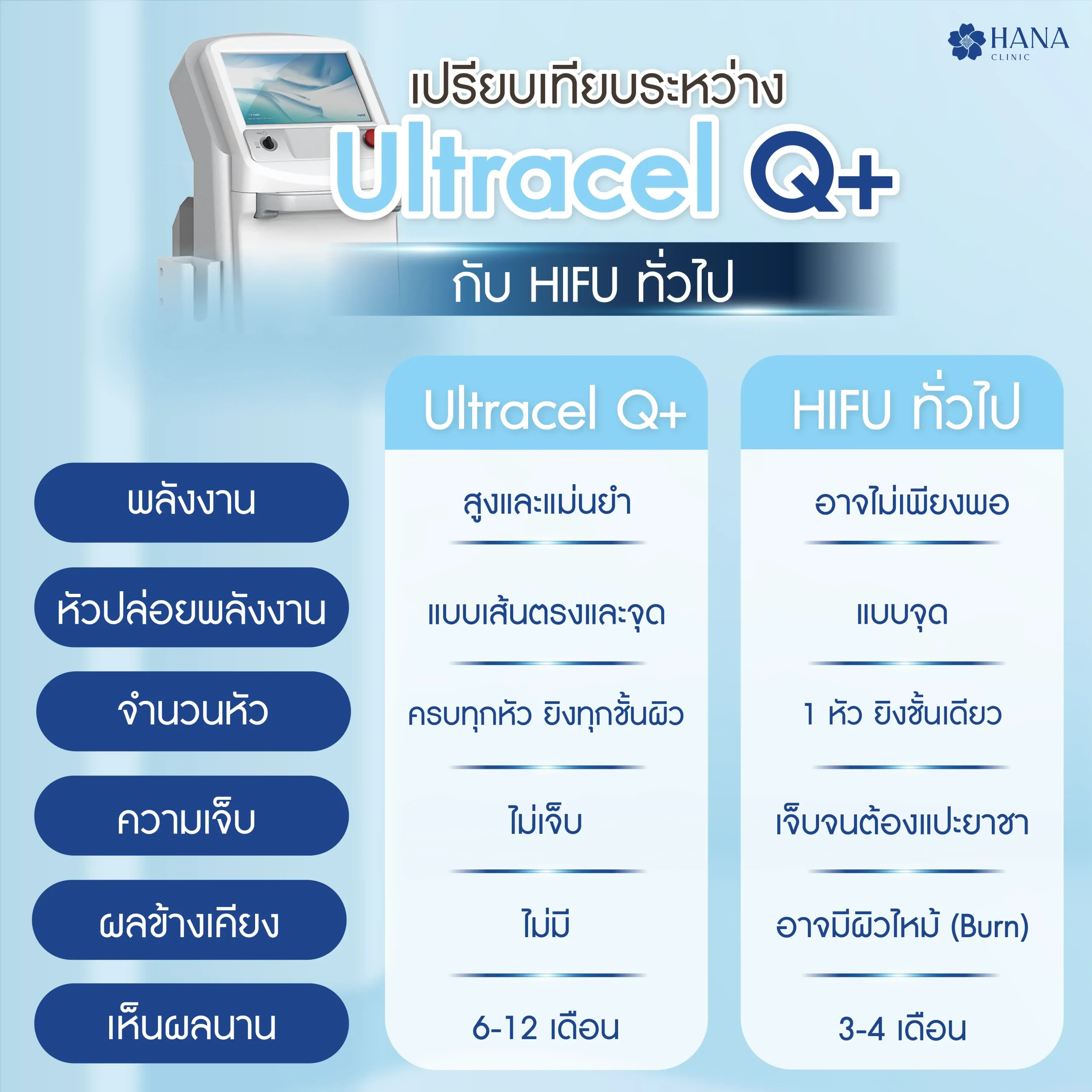 A: HIFU อาจรู้สึกจี๊ด ๆ หรืออุ่น ๆ ขณะทำ โดยเครื่อง Ultracel Q+ จะเจ็บน้อยกว่ารุ่นเดิมมาก ทำให้รู้สึกสบายขึ้นอย่างชัดเจน